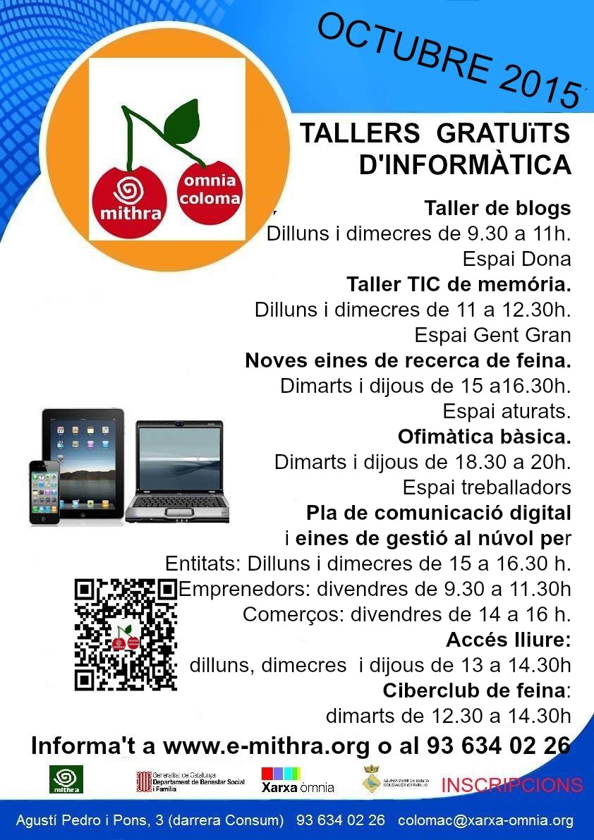Dimarts i dijous de 18.30 a 20h amb el suport del Servei local d’ocupació.Ofimàtica bàsica. Processador de textos, Full de càlcul i presentacions digitals.