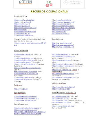 Els dimarts al matí oferim suport al servei ocupacional de la Maria del Mar. Als usuaris que ens ho demanen els hi repartim una fitxa amb recursos com aquesta. Feu clic a sobre per veure-la millor. No només trobareu els portals clasics (infojobs, laboris, etc) o locals (Coressa, Can Calderon), també recursos per a emprenedors, autónoms , etc. i una interessant secció de noves propostes per publicitar-se (blogs, videocurrículums, i fins i tot cvsamarretes¡¡¡).