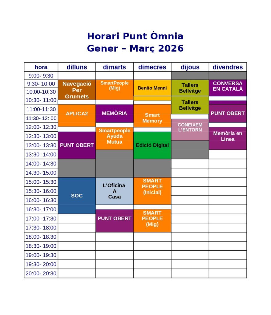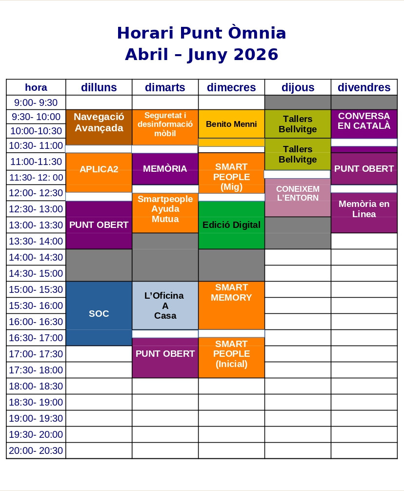 Tots aquells que no estiguin dintre de cap curs, pel motiu que sigui, que sapigueu que teniu les franges horàries del Punt Obert, per consultar, practicar o simplement fer un ús de les TIC, l’espai de Memòria per venir a practicar i posar en forma la teva ment o l’espai per a practicar la parla en català.