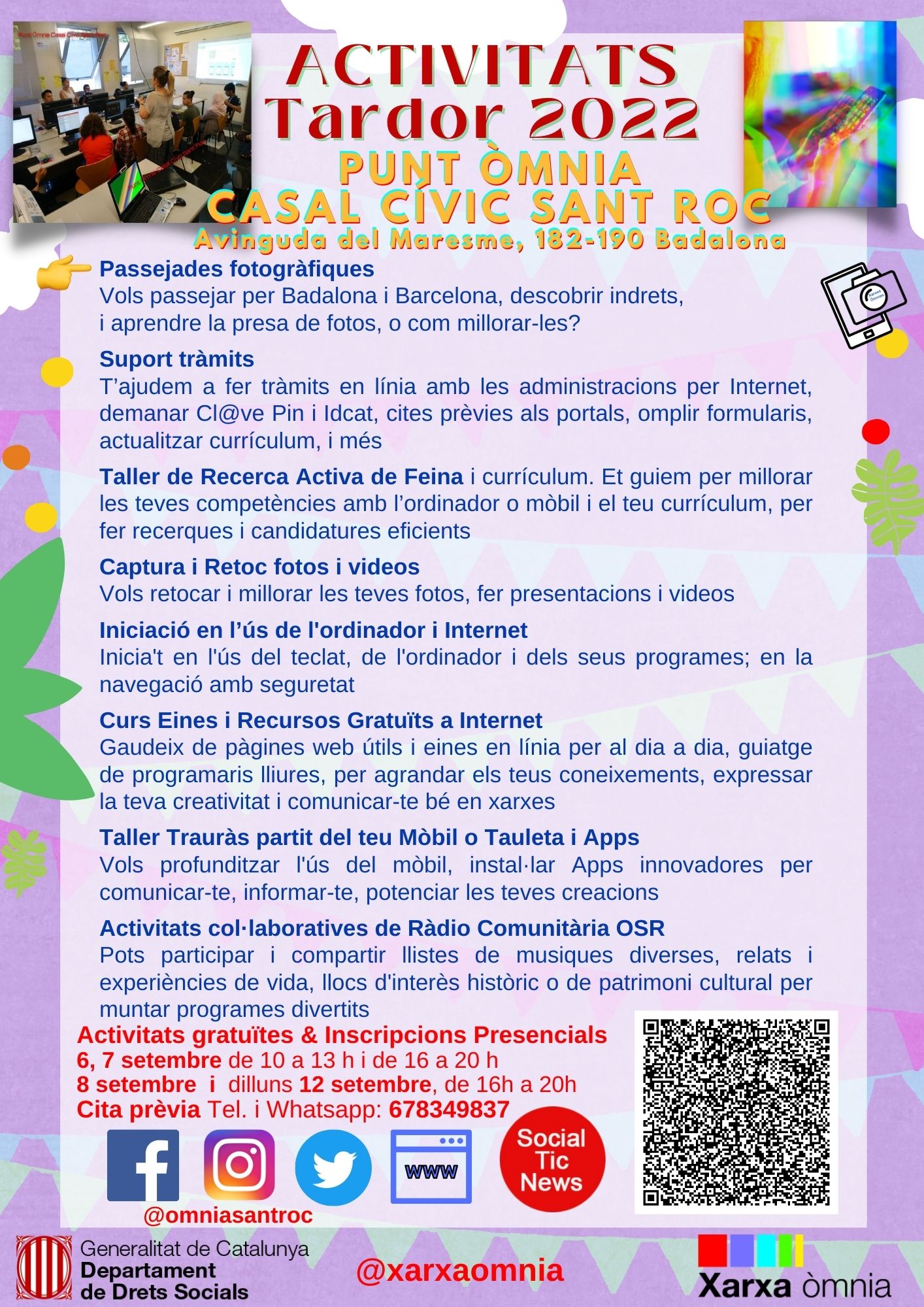 Nova ofertes de serveis i tallers gratuïts per a la ciutadania que ofereix el Punt Òmnia Casal Cívic i Comunitari del barri de Sant Roc Badalona.