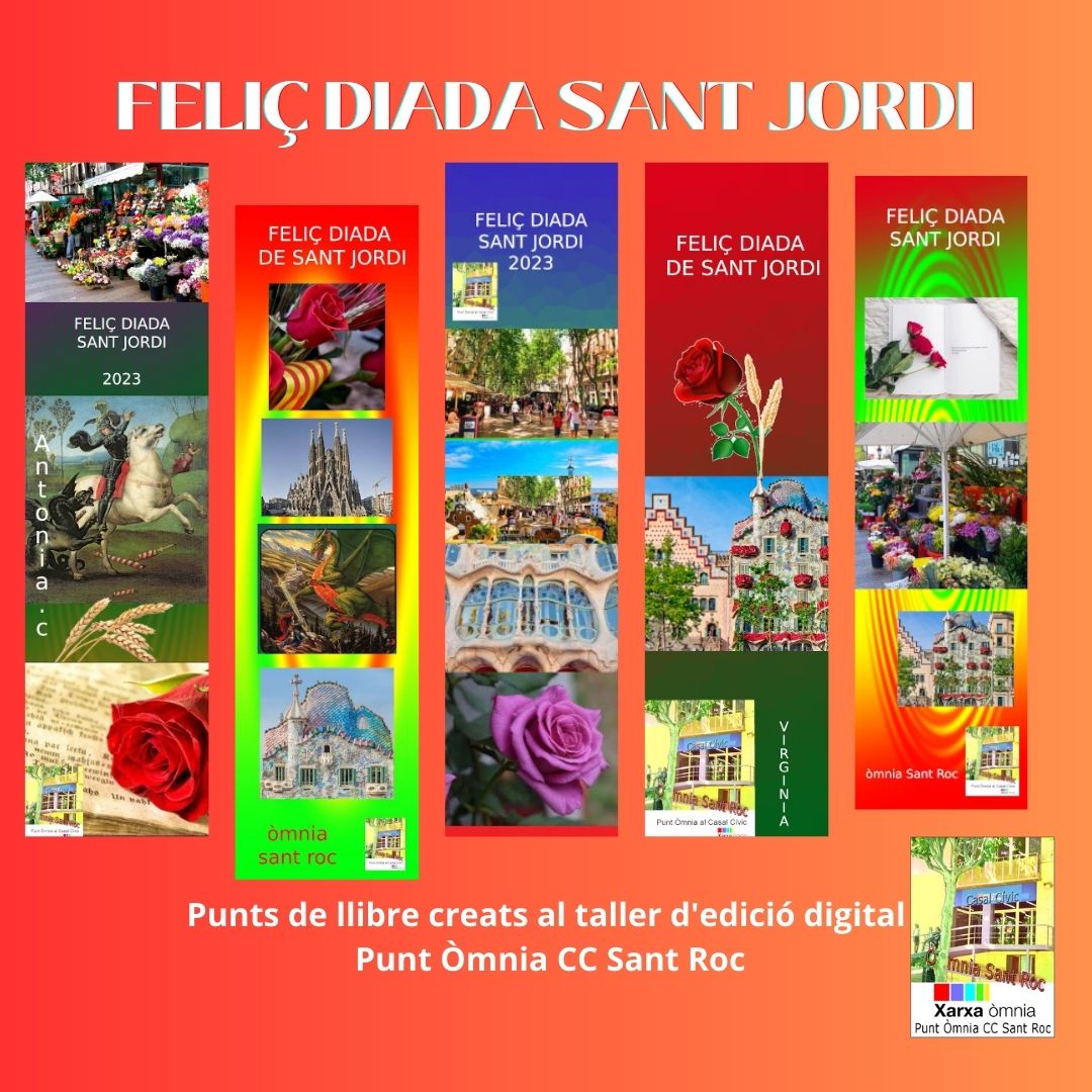 Al Punt Òmnia Casal Cívic Sant Roc, es va preparar la celebració de la Diada de Sant Jordi. Els participants van cercar informacions sobre tradicions populars, descarregar i retocar fotos, aplicar efectes, i crear muntatges creatius en format de punts de llibre. Vam compartir les creacions per correu electrònic, Whatsapp i a les xarxes socials.